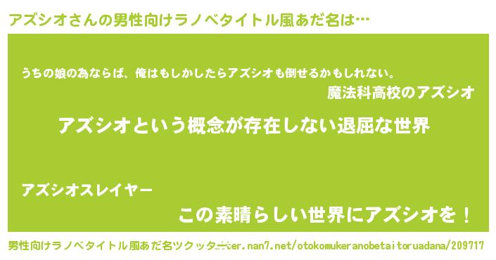 | 女子向けラノベタイトル風あだ名 | 『異世界で失敗しない100のアズシオ』 |