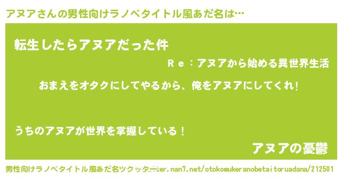 | ヘコむあだ名 | 『アヌにゅー』『豆乳』『アヌア(笑)』 |