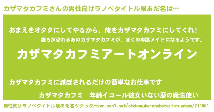 | 女子向けラノベタイトル風あだ名 | 『誰かこのカザマタカフミを説明してください! ~契約から始まるウェディング~』 |