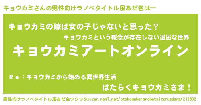 | 女子向けラノベタイトル風あだ名 | 『キョウカミ姫と円卓の騎士』 |