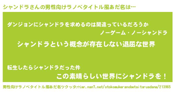 | 女子向けラノベタイトル風あだ名 | 『異世界で失敗しない100のシャンドラ』 |