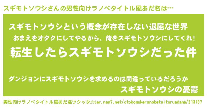 | 女子向けラノベタイトル風あだ名 | 『婚約破棄系悪役スギモトソウシに転生したので、保身に走りました。』 |