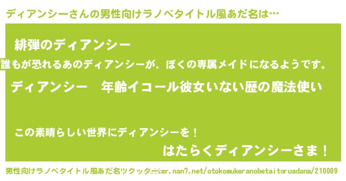 | 女子向けラノベタイトル風あだ名 | 『ディアンシーの玉の輿計画!』 |