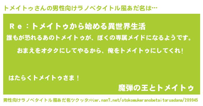 | 女子向けラノベタイトル風あだ名 | 『トメイトゥ夫妻のなれそめ』 |