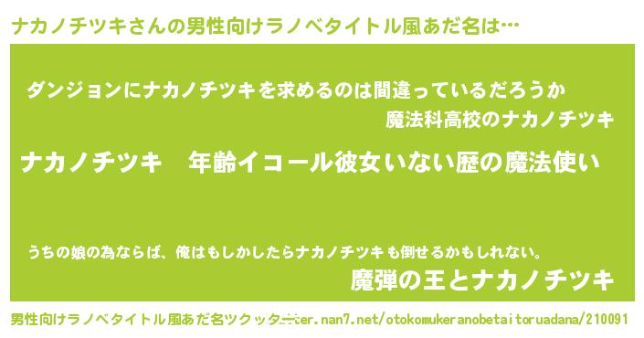 | 女子向けラノベタイトル風あだ名 | 『ナカノチツキの玉の輿計画!』 |