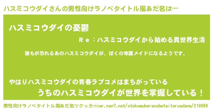 | 女子向けラノベタイトル風あだ名 | 『異世界でカフェハスミコウダイを開店しました。』 |