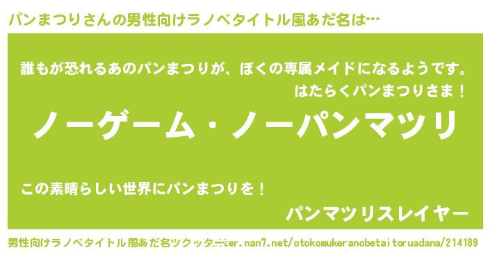 | 女子向けラノベタイトル風あだ名 | 『死神パンまつりの再婚』 |
