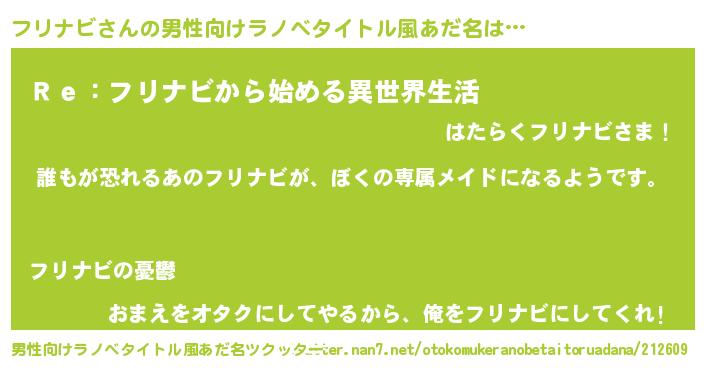 | 女子向けラノベタイトル風あだ名 | 『異世界でカフェフリナビを開店しました。』 |