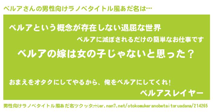 | 女子向けラノベタイトル風あだ名 | 『ベルア様がみてる』『ベルアの契約王妃』 |