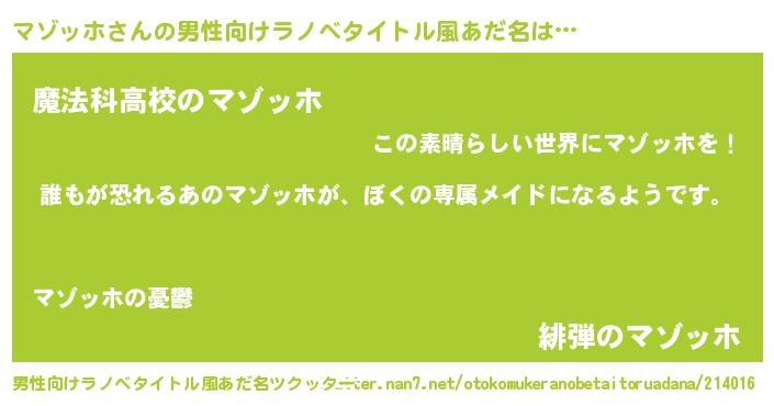 | 女子向けラノベタイトル風あだ名 | 『異世界でカフェマゾッホを開店しました。』 |