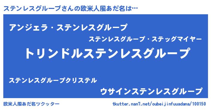 | 男性向けラノベタイトル風あだ名 | 『ステンレスグループ~年齢イコール彼女いない歴の魔法使い~』 |