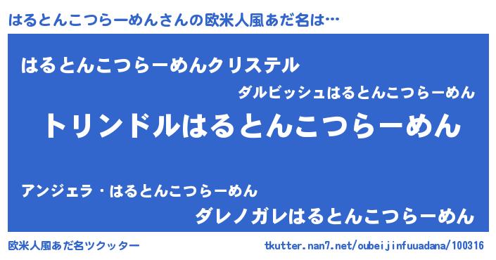 | 男性向けラノベタイトル風あだ名 | 『はるとんこつらーめん~年齢イコール彼女いない歴の魔法使い~』 |