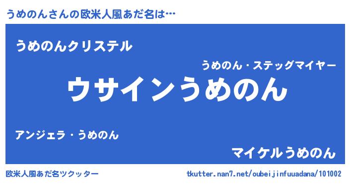| 男性向けラノベタイトル風あだ名 | 『うめのんの嫁は女の子じゃないと思った?』 |