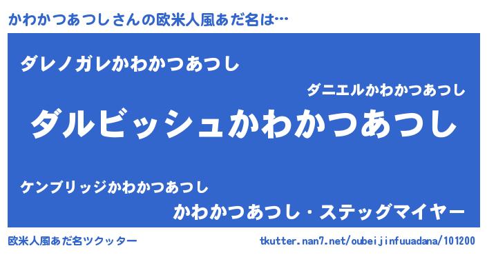 | 女子向けラノベタイトル風あだ名 | 『異世界で失敗しない100のかわかつあつし』 |