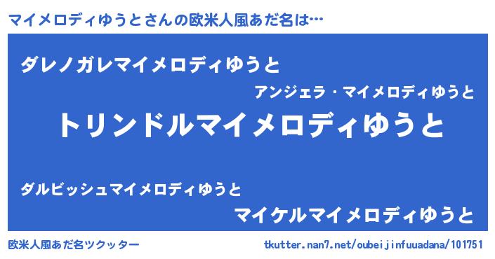 | 男性向けラノベタイトル風あだ名 | 『マイメロディゆうと~年齢イコール彼女いない歴の魔法使い~』 |