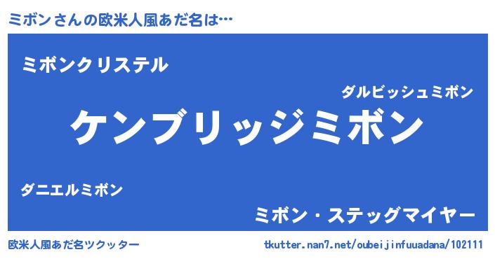 | 男性向けラノベタイトル風あだ名 | 『Re:ミボンから始める異世界生活』 |