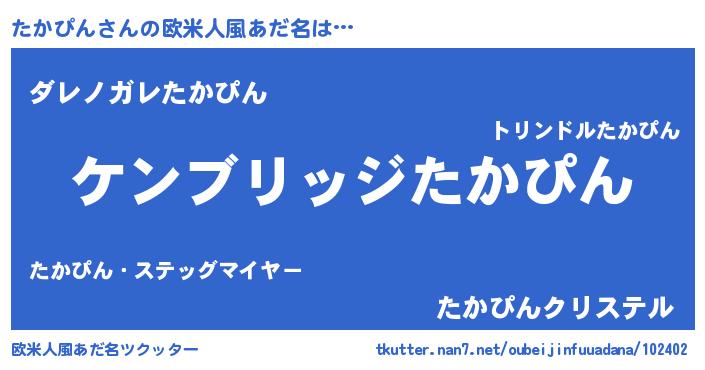| 男性向けラノベタイトル風あだ名 | 『Re:たかぴんから始める異世界生活』 |
