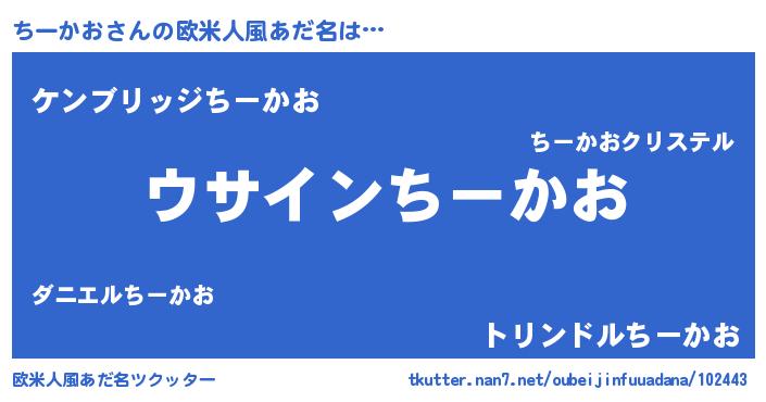 | 男性向けラノベタイトル風あだ名 | 『ちーかおの嫁は女の子じゃないと思った?』 |