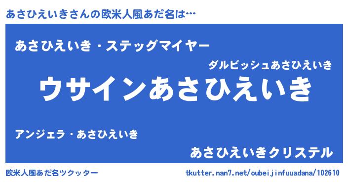 | 男性向けラノベタイトル風あだ名 | 『あさひえいきの嫁は女の子じゃないと思った?』 |