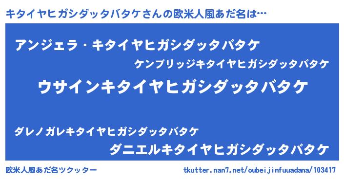| 男性向けラノベタイトル風あだ名 | 『キタイヤヒガシダッタバタケの嫁は女の子じゃないと思った?』 |