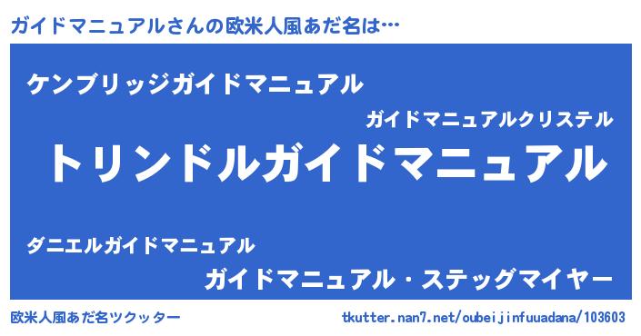 | 男性向けラノベタイトル風あだ名 | 『ガイドマニュアル~年齢イコール彼女いない歴の魔法使い~』 |