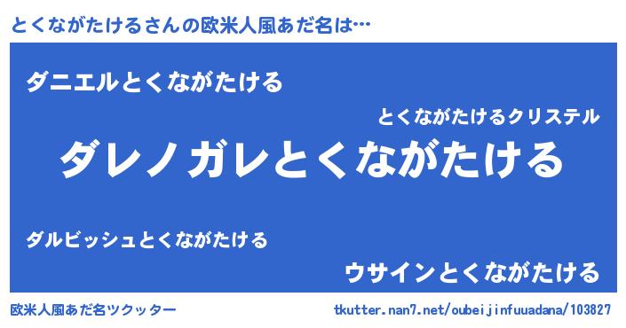 | 男性向けラノベタイトル風あだ名 | 『この素晴らしい世界にとくながたけるを!』 |