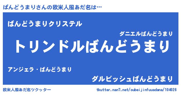 | 男性向けラノベタイトル風あだ名 | 『ばんどうまり~年齢イコール彼女いない歴の魔法使い~』 |
