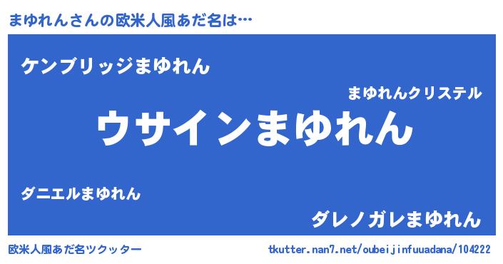 | 男性向けラノベタイトル風あだ名 | 『まゆれんの嫁は女の子じゃないと思った?』 |
