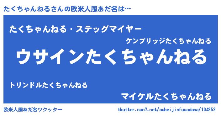| 男性向けラノベタイトル風あだ名 | 『たくちゃんねるの嫁は女の子じゃないと思った?』 |