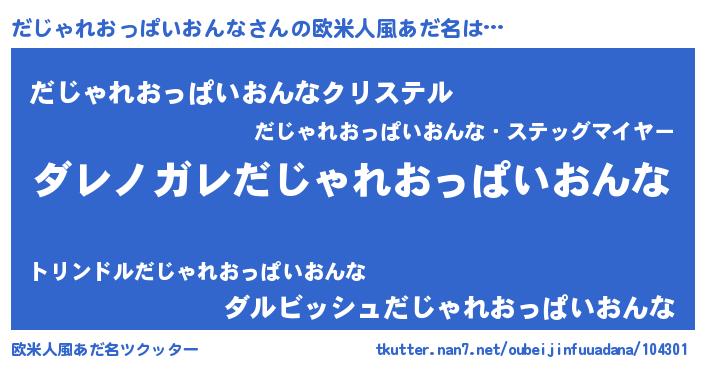 | 男性向けラノベタイトル風あだ名 | 『この素晴らしい世界にだじゃれおっぱいおんなを!』 |