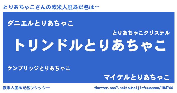 | 男性向けラノベタイトル風あだ名 | 『転生したらとりあちゃこだった件』 |