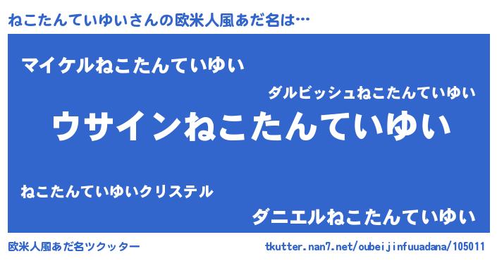 | 男性向けラノベタイトル風あだ名 | 『ねこたんていゆいの嫁は女の子じゃないと思った?』 |
