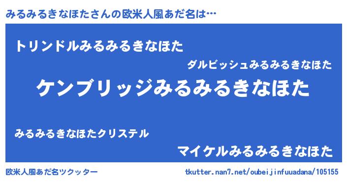 | 男性向けラノベタイトル風あだ名 | 『Re:みるみるきなほたから始める異世界生活』 |
