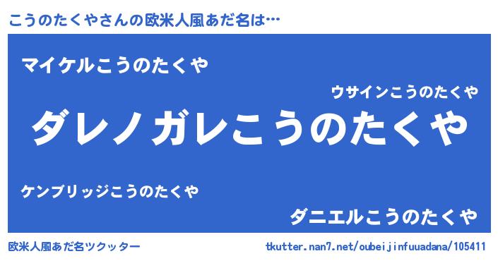| 男性向けラノベタイトル風あだ名 | 『魔弾の王とこうのたくや』 |