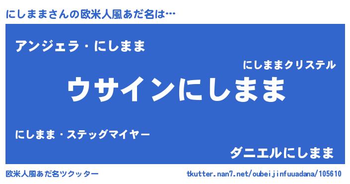 | 男性向けラノベタイトル風あだ名 | 『にしままの嫁は女の子じゃないと思った?』 |