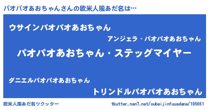 | 男性向けラノベタイトル風あだ名 | 『うちのパオパオあおちゃんが世界を掌握している!』 |