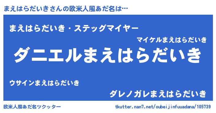 | 女子向けラノベタイトル風あだ名 | 『まえはらだいき夫妻のなれそめ』 |