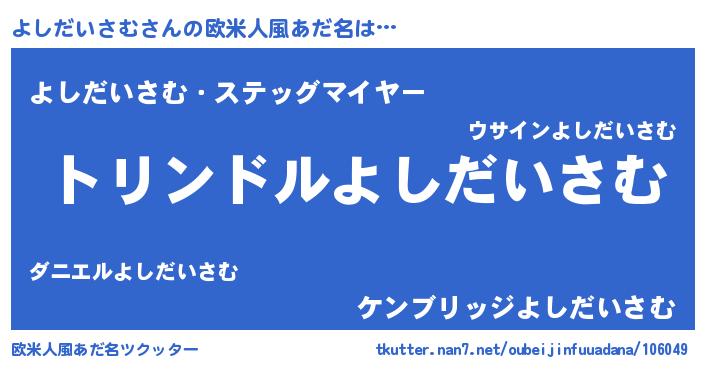 | 男性向けラノベタイトル風あだ名 | 『よしだいさむ~年齢イコール彼女いない歴の魔法使い~』 |