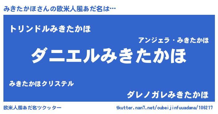 | 男性向けラノベタイトル風あだ名 | 『おまえをオタクにしてやるから、俺をみきたかほにしてくれ! 』 |