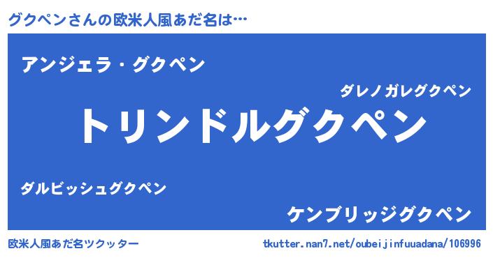 | 男性向けラノベタイトル風あだ名 | 『グクペン~年齢イコール彼女いない歴の魔法使い~』 |