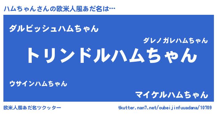 | 男性向けラノベタイトル風あだ名 | 『ハムちゃん~年齢イコール彼女いない歴の魔法使い~』 |