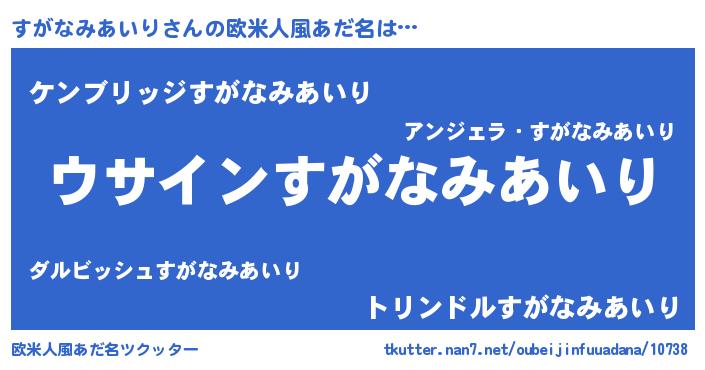 | 男性向けラノベタイトル風あだ名 | 『すがなみあいりの嫁は女の子じゃないと思った?』 |