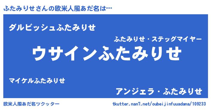 | 男性向けラノベタイトル風あだ名 | 『ふたみりせの嫁は女の子じゃないと思った?』 |