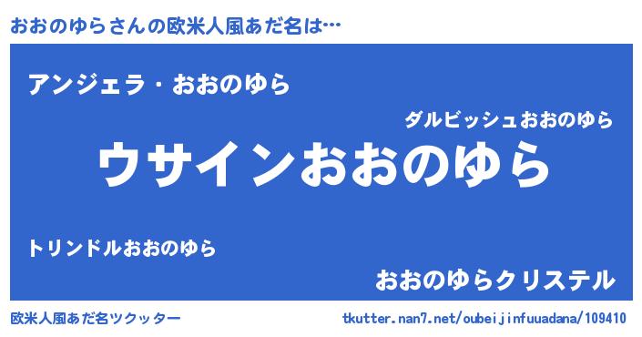 | 男性向けラノベタイトル風あだ名 | 『おおのゆらの嫁は女の子じゃないと思った?』 |