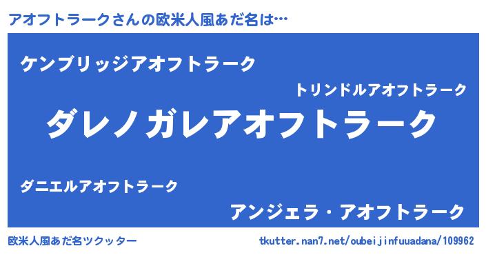 | 意味不明あだ名 | 『住所不定無職アオフトラーク(5歳)』 |