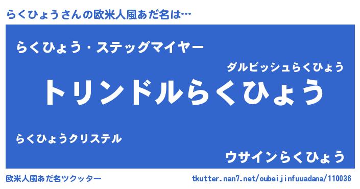 | 男性向けラノベタイトル風あだ名 | 『転生したららくひょうだった件』 |