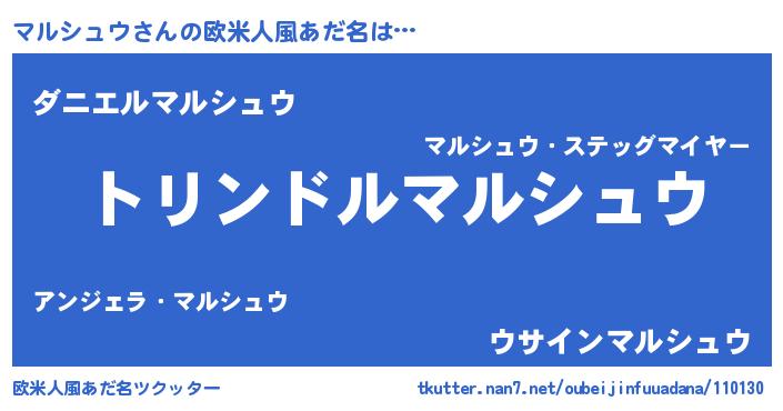| 男性向けラノベタイトル風あだ名 | 『転生したらマルシュウだった件』 |