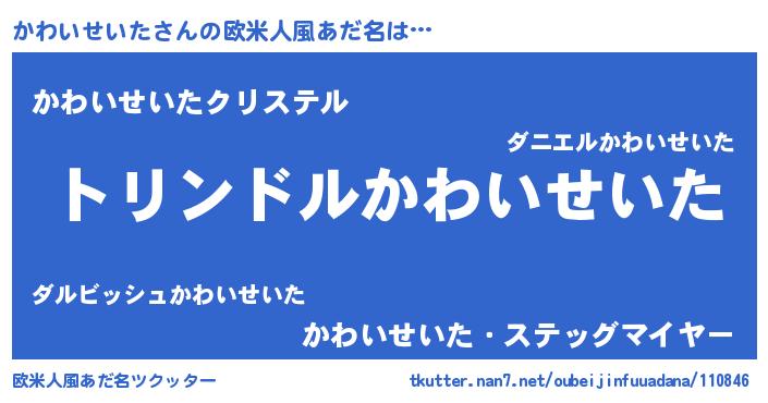 | 男性向けラノベタイトル風あだ名 | 『かわいせいた~年齢イコール彼女いない歴の魔法使い~』 |