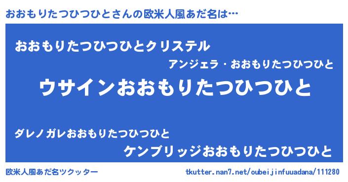 | 女子向けラノベタイトル風あだ名 | 『おおもりたつひつひとの卵を拾いまして』 |