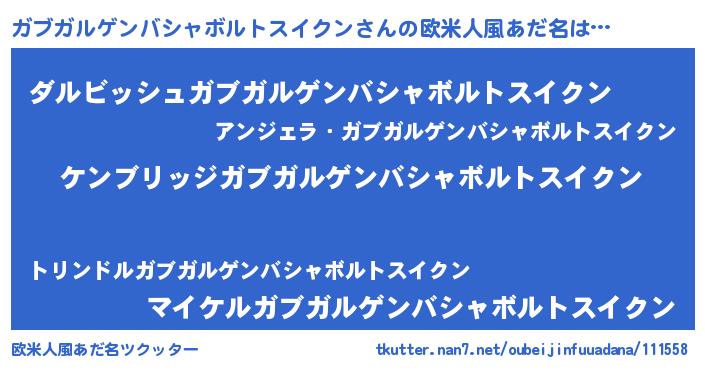 | 男性向けラノベタイトル風あだ名 | 『Re:ガブガルゲンバシャボルトスイクンから始める異世界生活』 |